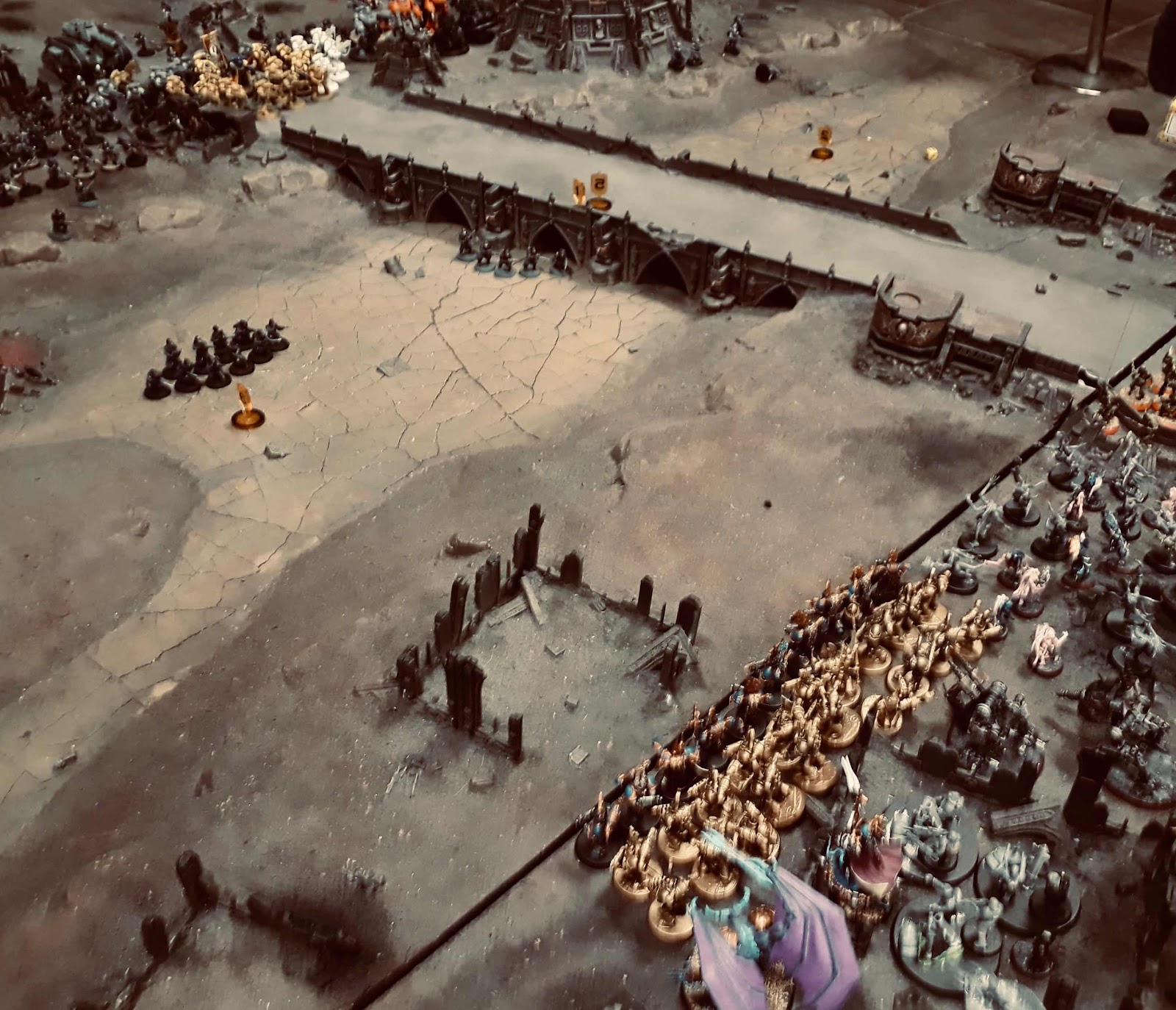 Having scouted ahead, the imperial force knew the chaos forces were holding back, out of range of the imperial combined firepower until their intentions became clear, so Lydoro took advantage of this by sending his infantry forward to take key objectives on the winding river. The guard took up positions wherever cover allowed, while the astartes themselves marched onto the bridge. This would be a “bite and hold” operation. Now the imperium just needed to hold and defeat whatever the traitor forces threw against them.